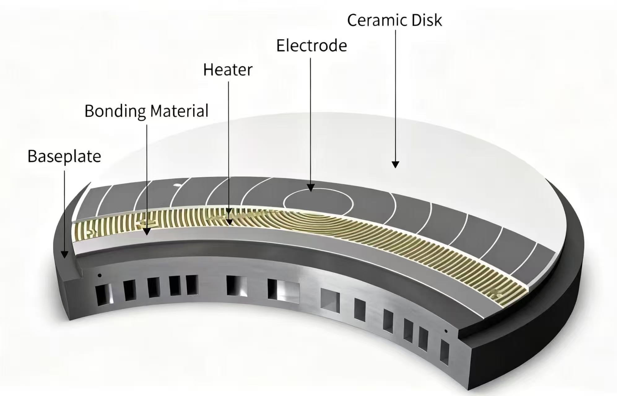 Zeramikazko mandril elektrostatikoakelektrodoen eta obleen artean sortutako eremu elektrostatikoa erabiltzen duten doitasun-osagaiak dira, obleak estutu eta finkatzeko. Erdieroaleak, pantaila lauak eta optika bezalako eremuetan asko aplikatzen dira, eta goi-mailako ekipoen oinarrizko osagaiak dira, hala nola PVD gailuak, grabatzeko makinak eta ioi-inplantagailuak.