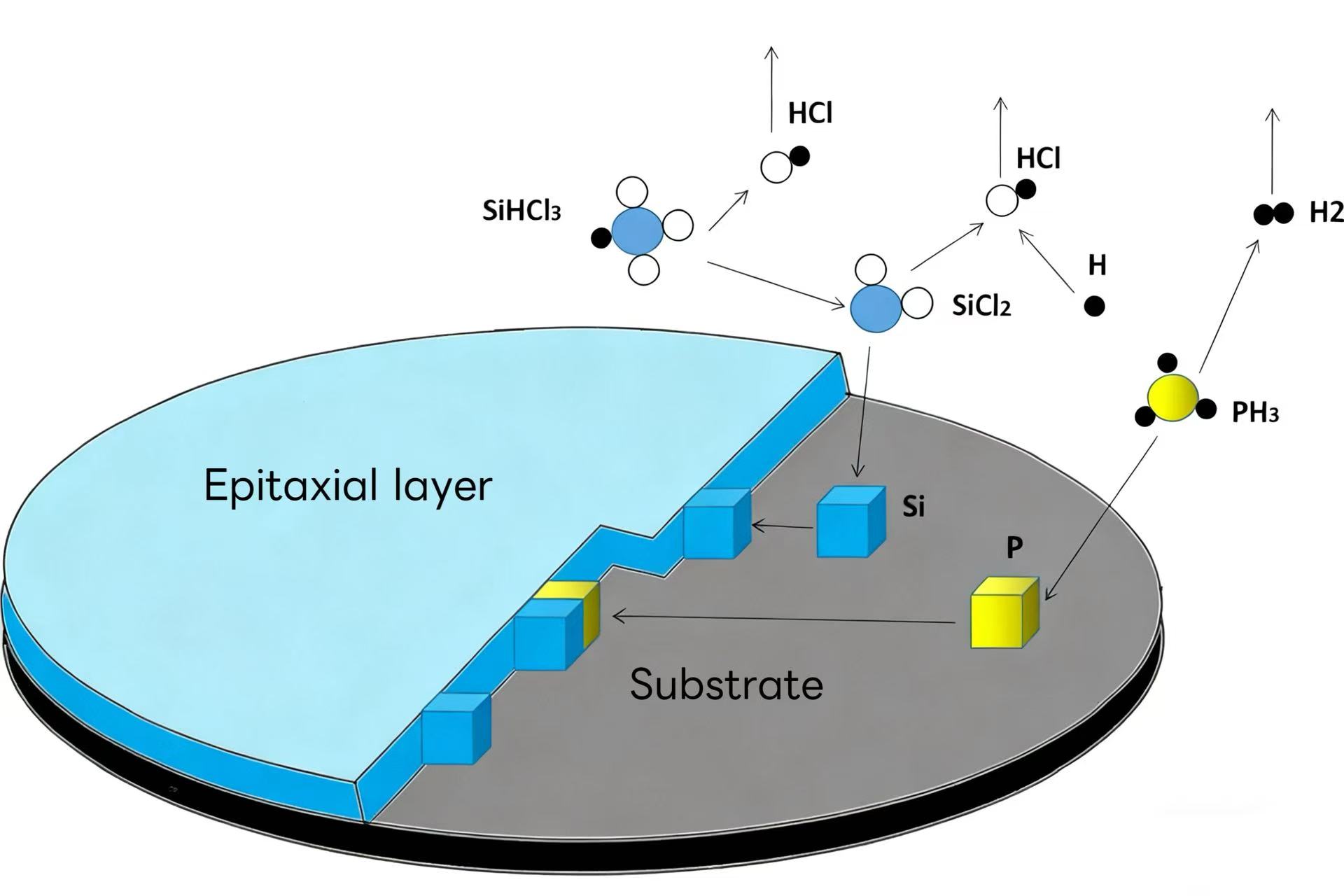 Silizio epitaxiak, oro har, lurrun faseko epitaxi-labe bat erabiltzen du. Bere printzipioa da silizio-iturriaren deskonposizioak (esaterako, silanoa, diklorosilanoa, triklorosilanoa eta silizio tetrakloruroa hidrogenoarekin erreakzionatzen duela silizioa sortzeko. Hazkuntzan, PH₃ eta B₂H₆ bezalako gas dopintzaileak aldi berean sar daitezke. Dopinaren kontzentrazioa zehatz-mehatz kontrolatzen da gasaren presio partzialaren erresistentzia geruza espezifiko batekin osatzeko.