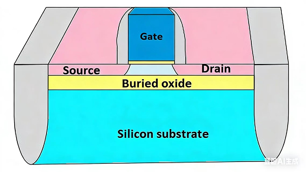 SiO2 geruza isolatzaile baten presentzia eraginkortasunez isolatzen du transistorea azpiko silizio-substratutik. Isolamendu honek geruza aktibotik substratura nahi ez den korrontea murrizten du. Ihes-korrontea handitzen da tenperaturarekin, eta horrela txiparen fidagarritasuna nabarmen hobetzen da tenperatura altuko inguruneetan.