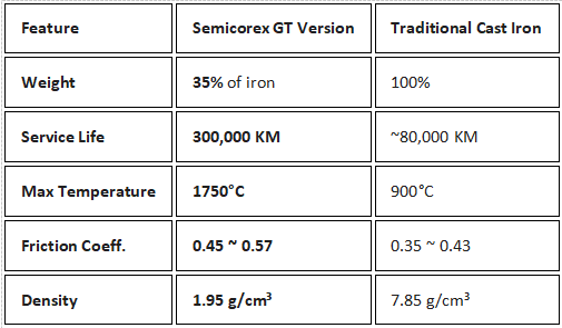 Masa murriztea: GT bertsioak burdinurtuzko disko estandarraren % 35 baino ez du pisatzen.